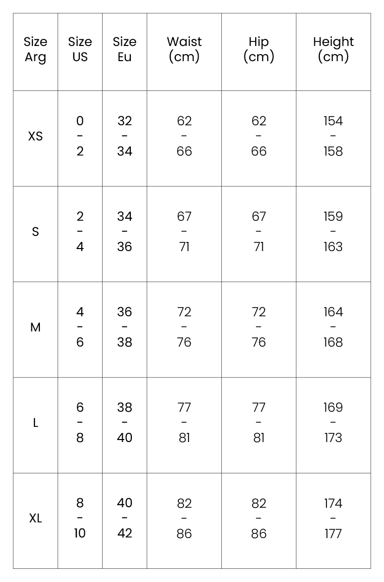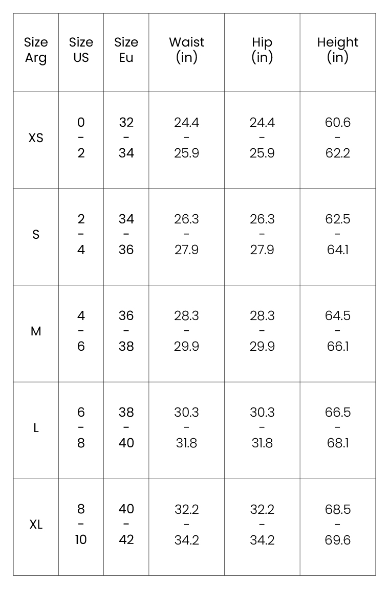 Si tus medidas de cadera y cintura sugieren dos tallas diferentes, compra la talla según tus caderas.