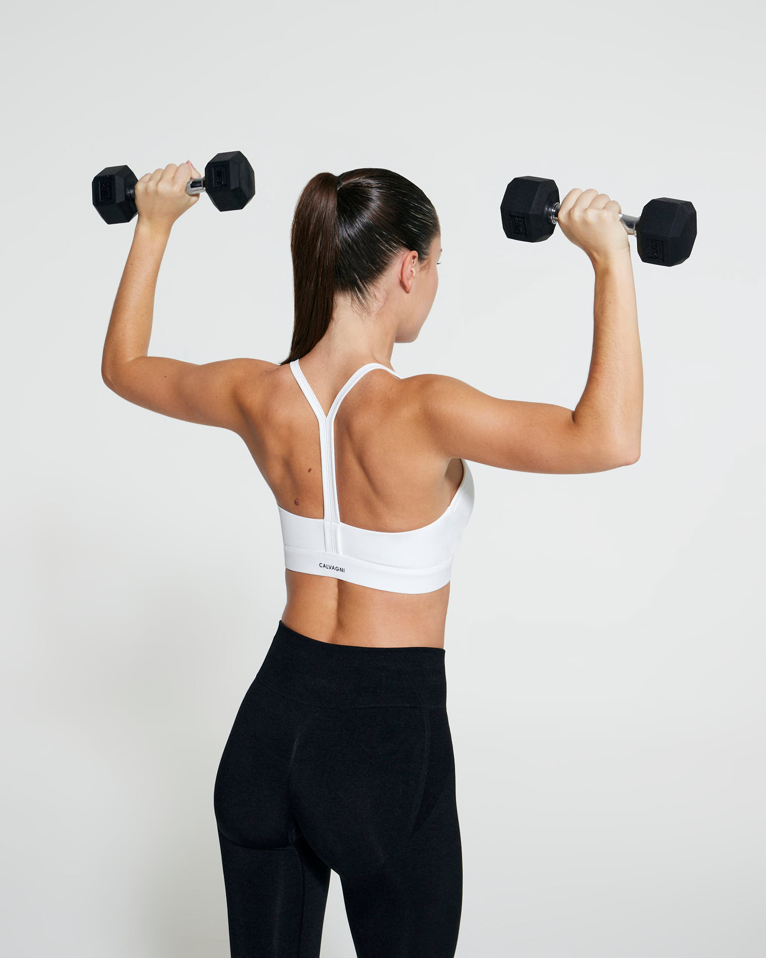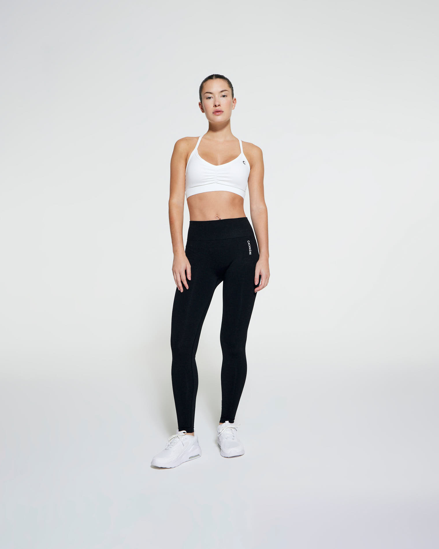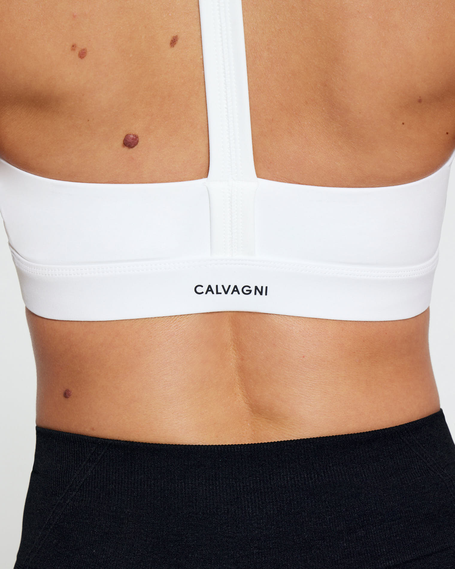 Lycra top, V-neckline with front ruching, and central back strap.